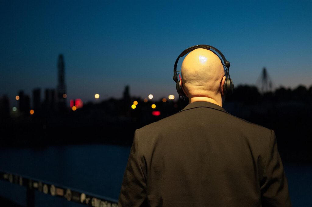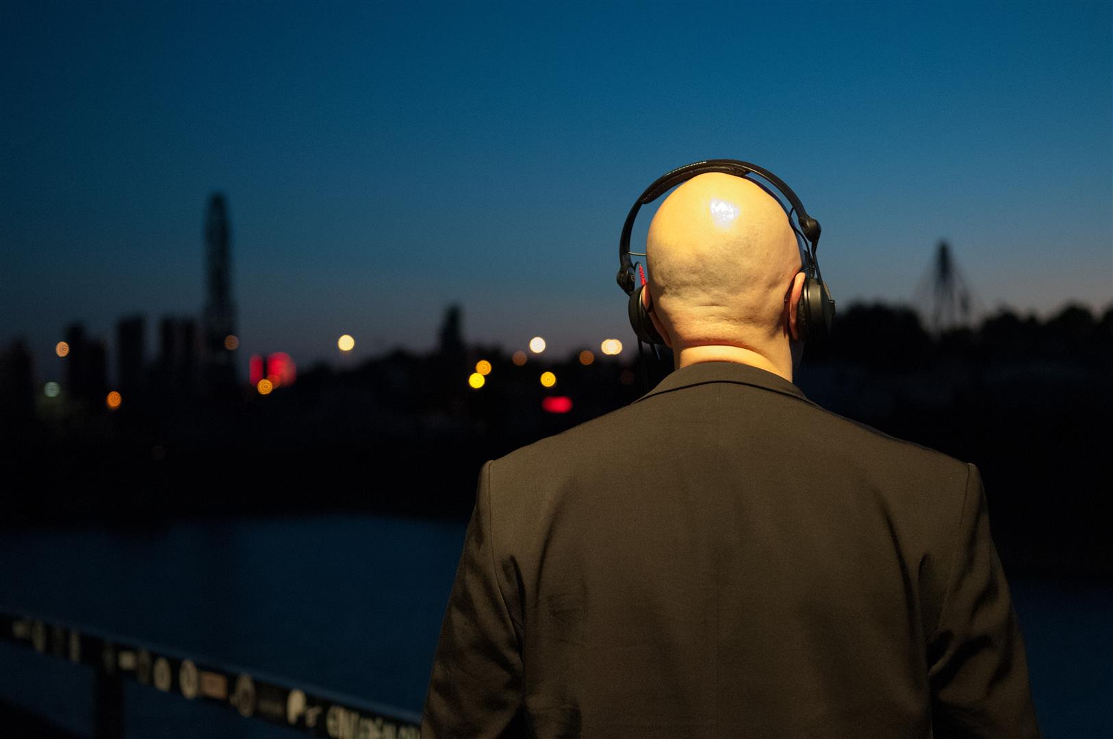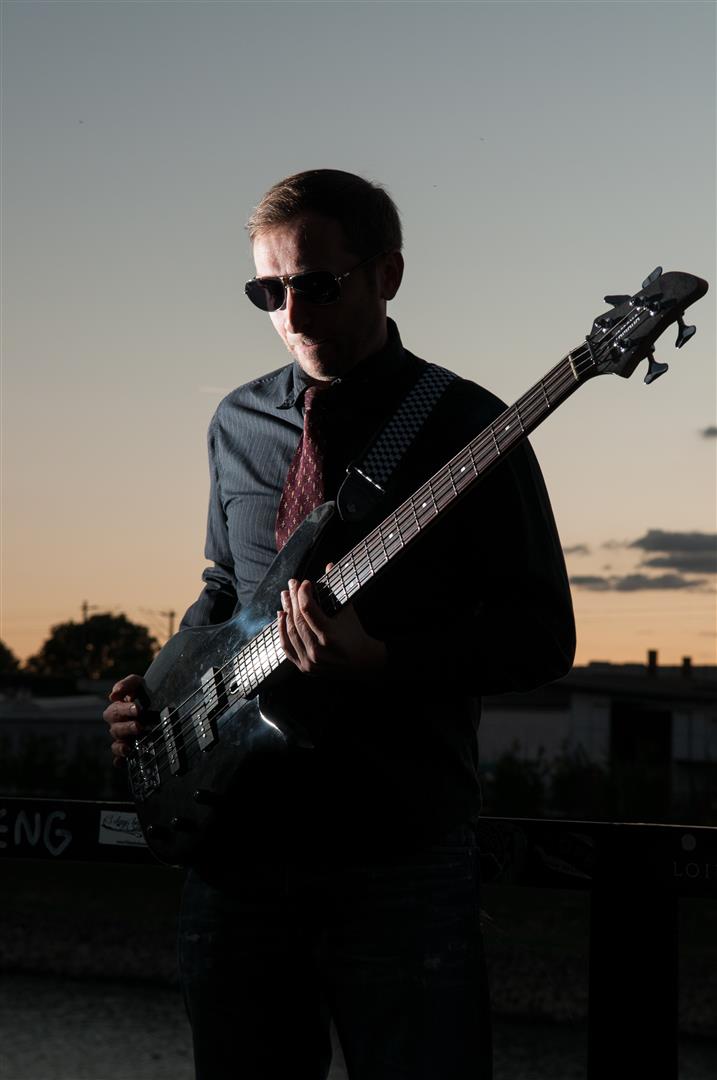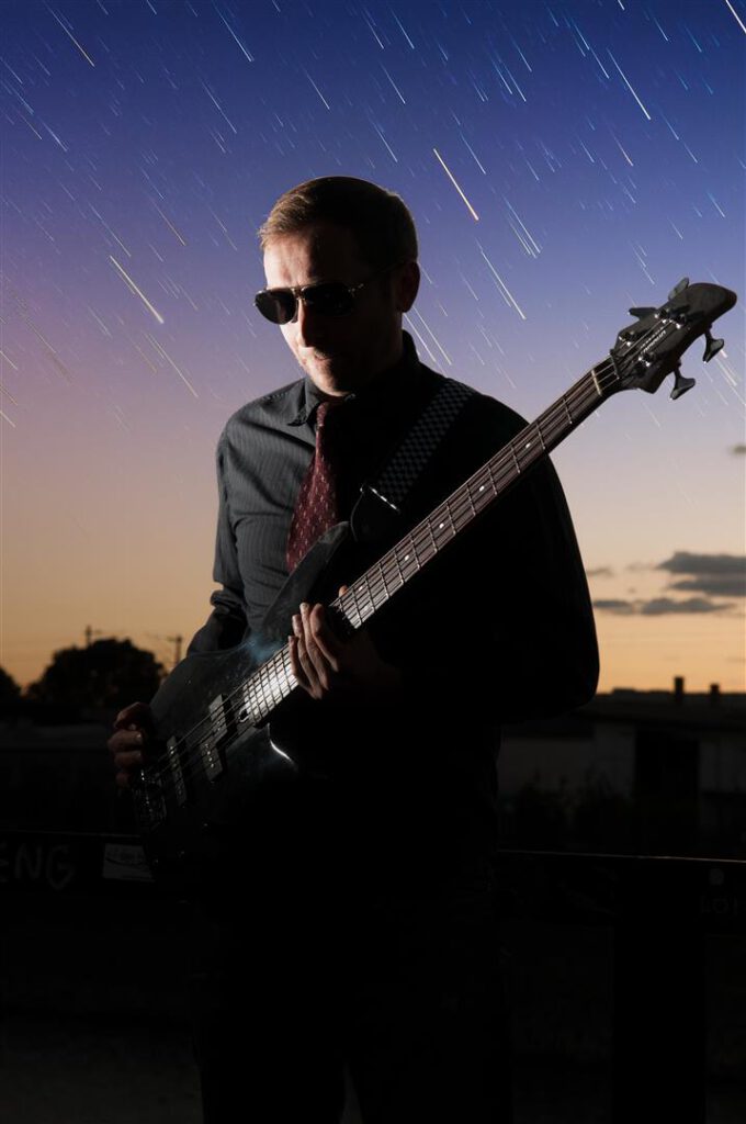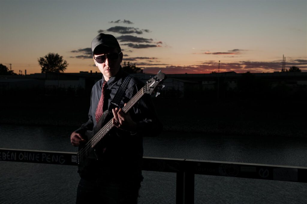 Direkt an der Popakademie Mannheim bot sich uns bei Sonnenuntergang ein tolles Panorama für unser Vorhaben. Die E-Gitarre reflektiert sehr schön den dezent eingesetzten Blitz der nur das Nötigste erhellt, der Sonnenuntergang kommt gut zur Geltung. Weniger ist mehr.