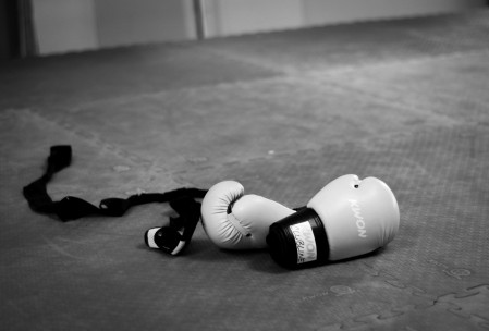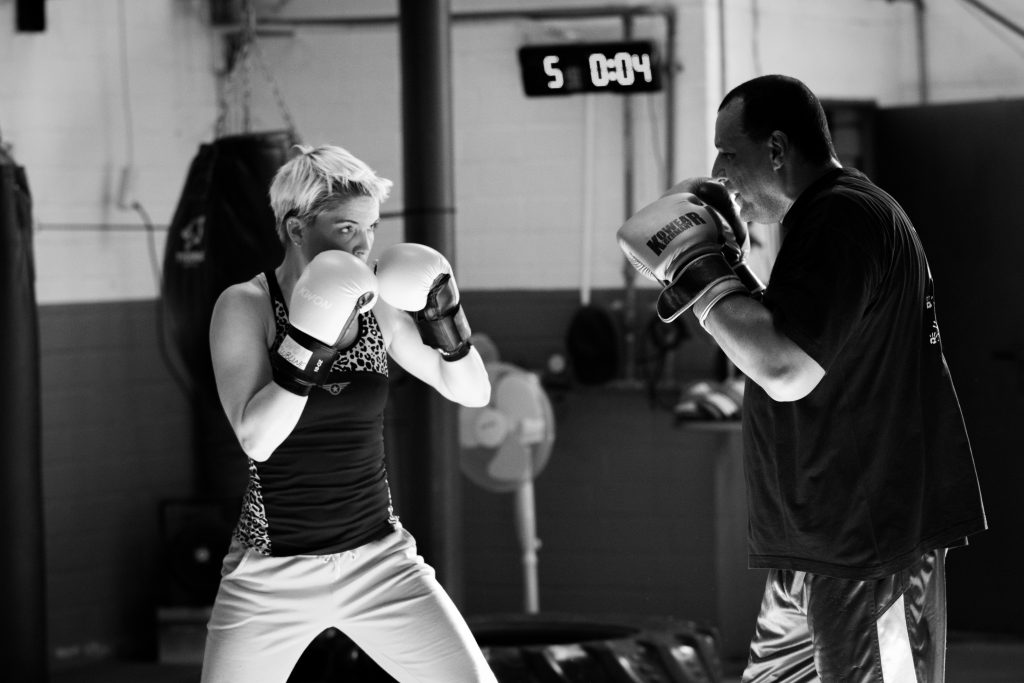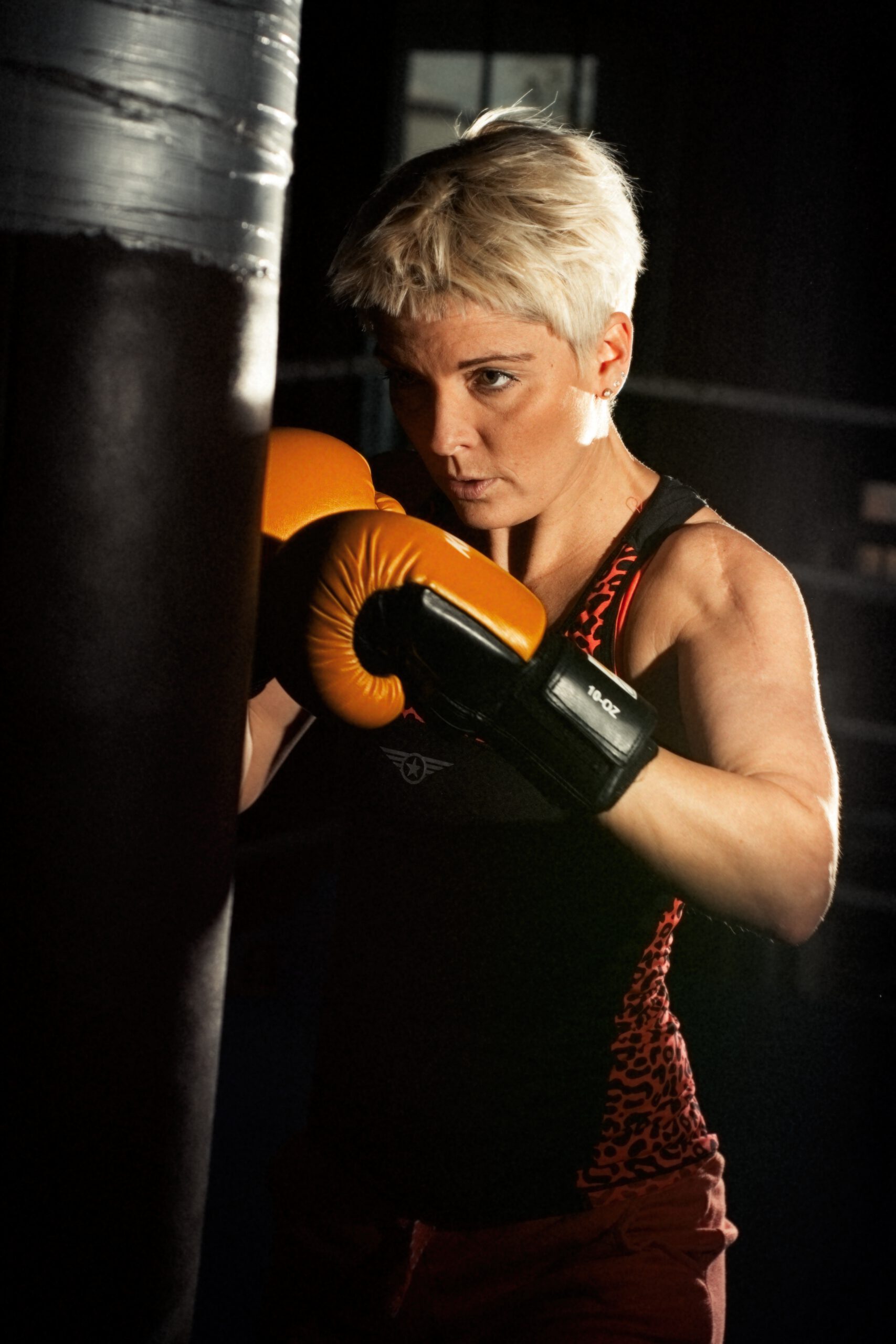 Diese Aufnahmen entstanden in einer Boxhalle während des Trainings am Sandsack. Das Bild schwebte mir in dieser Form schon lange im Kopf herum und ich war froh dass wir es ziemlich gut umsetzen konnten. Wir haben ein Speedlite vorne seitlich eingesetzt und ein weiteres Speedlite als Konturlicht von hinten.